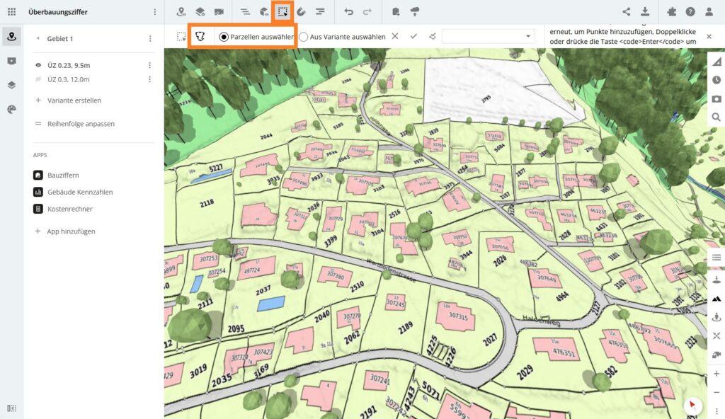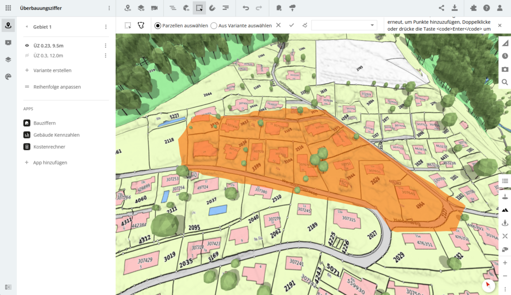 Parzellen selektieren und als Flächen in die Variante übernehmen