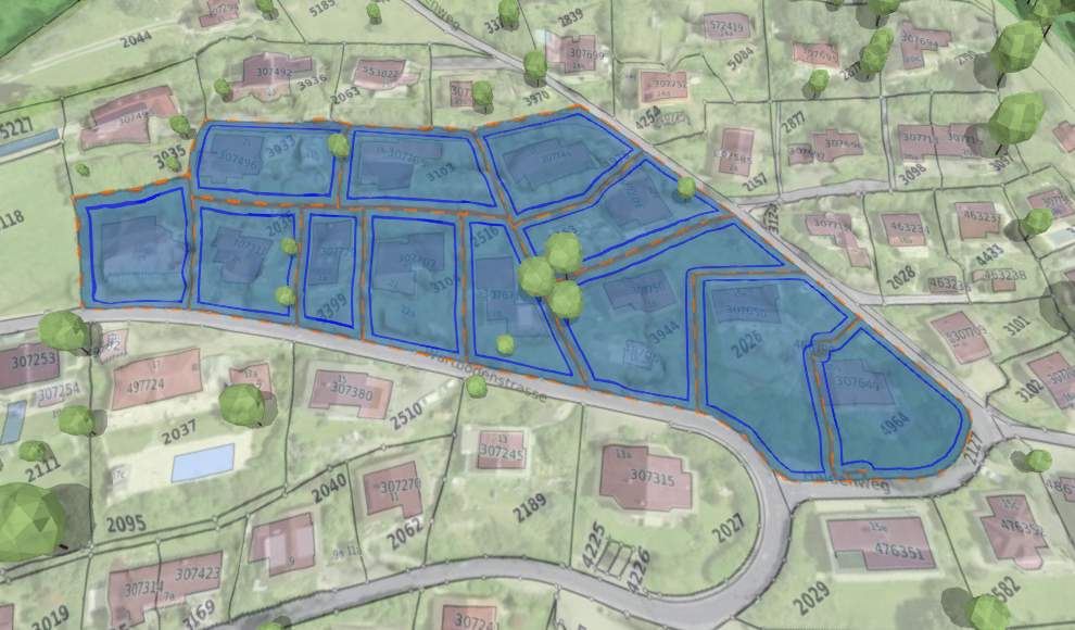 Geometrien, welche man von den Parzellen abziehen möchte (z. B. Strassen, Wald, Gewässer etc.) kann man als Datensatz in die Umgebung hochladen. Diese Daten müssen zwingend als WGS84 im GeoJSON Format hochgeladen werden.