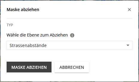Selektiere die gewünschten Objekte (hier nur die Parzellen)und klicke auf der Rechten Seite auf das Tool Maske abziehen. Im Popup werden alle Layer vom Typ GeoJSON und Koordinatensystem QGS84 angezeigt. Wähle ein oder mehrere Layer aus und klicke auf Maske abziehen.
