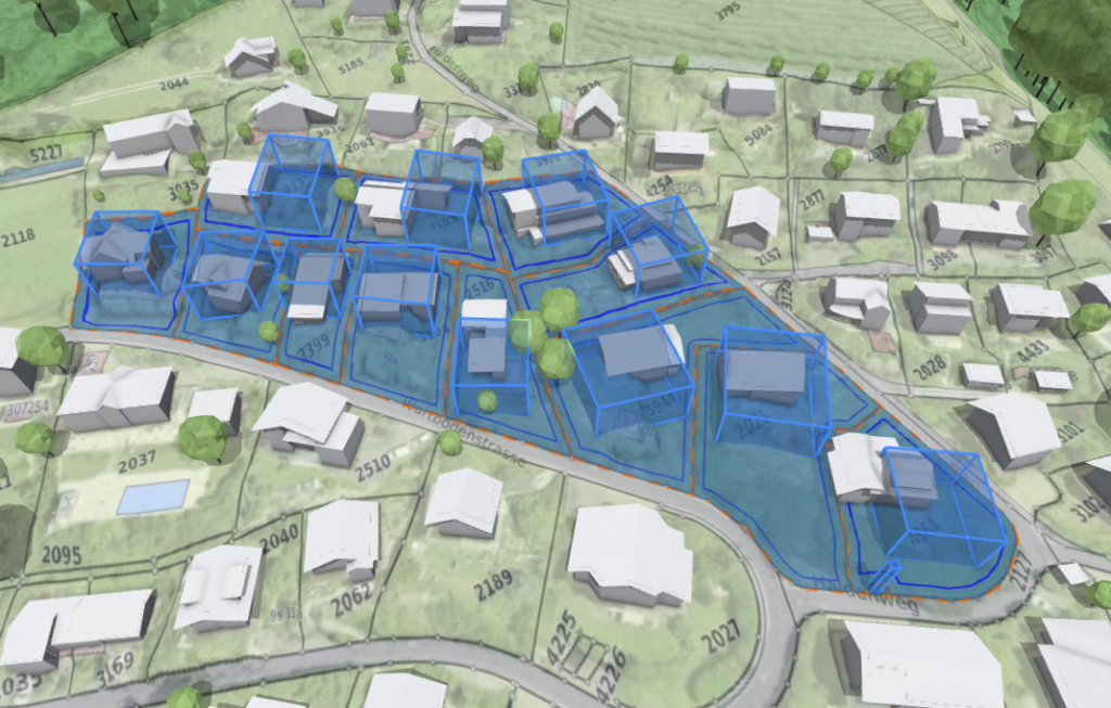 Wiederhole das für mehrere Varianten und Projekte. Jedes Quartier kann so ein einem Projekt abgebildet werden. In der ersten Variante kann z. B. der aktuelle Stand angezeigt werden, und die Folgevarianten unterschiedliche Überbauungsziffern darstellen.