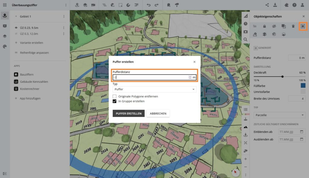 Mit dem Puffer-Tool können von den selektierten Polygonen neue Polygone mit einem bestimmten Abstand erstellt werden, um zum Beispiel Grenzabstände darzustellen. Klicke dazu auf das Puffer-Icon und wähle eine negative Pufferdistanz, wenn das neue Polygon kleiner sein soll (nach innen verkleinern).