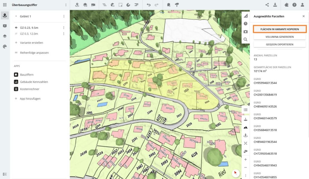 Schliesse die Selektion mit einem Doppelklick oder der Taste Enter ab. Mit gedrückter SHIFT-Taste kannst du einzelne Parzellen der Selektion wegnehmen oder hinzufügen. Klicke anschliessend auf Flächen in Varianten kopieren.