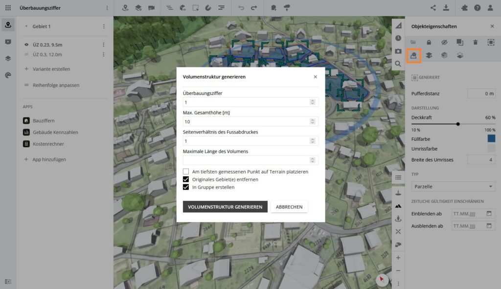 Gib die gewünschte Überbauungsziffer, die Maximale Gesamthöhe, sowie das Seitenverhältnis des Fussabdruckes an und klicke auf Volumenstruktur generieren.
