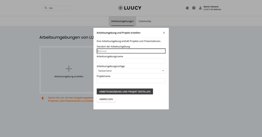 Stelle sicher, dass du beim Ort eine Adresse aus den Resultaten wählst. Die Adresse wird dazu verwendet, dass LUUCY direkt an den angegebenen Ort fliegt, wenn du die Arbeitsumgebung öffnest.
