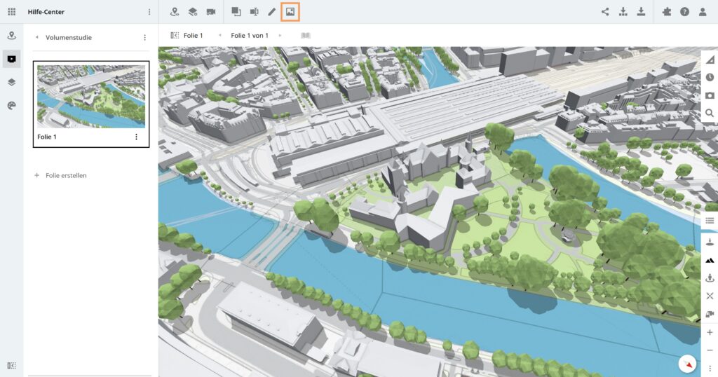 Klicke in der Präsentation auf Folie erstellen. Die neue Folie wird mit dem Screenshot der aktuellen Ansicht der Karte versehen und am Ende der Folienliste hinzugefügt.