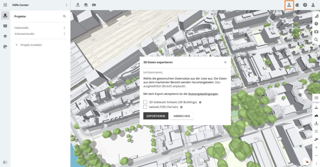 Öffne eine Arbeitsumgebung und klicke in der Toolbar oben rechts auf 3D-Datenexport.