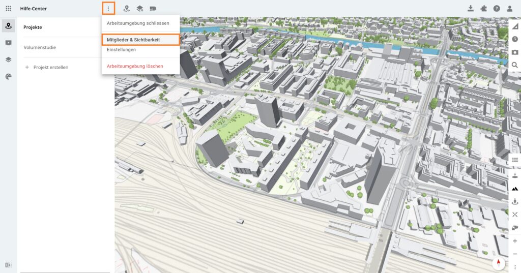 Klicke im Kontextmenü der Arbeitsumgebung auf Mitglieder & Sichtbarkeit, um die Sichtbarkeit der Arbeitsumgebung sowie die einzelnen Mitglieder zu sehen und zu bearbeiten.
