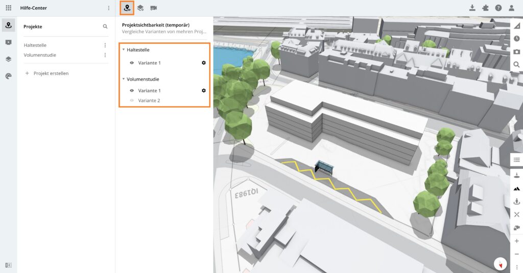 Klicke nun auf Gebäude oder Bäume aus den 3D-Datensätzen des Marktplatzes, um diese auszublenden und eigene Objekte an dieser Stelle zu modellieren.