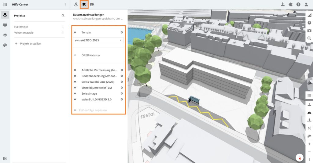 Im geöffneten Panel kannst du nun alle Umgebungsdaten aus der Arbeitsumgebung ein- oder ausblenden, sowie Einstellungen zu den Umgebungsdaten vornehmen. Klicke auf das Icon Datensatzeinstellungen, um die Deckkraft und Stile anzupassen.