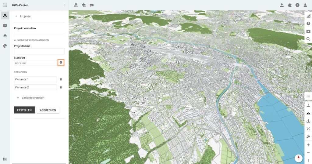 Schreibe den Ort in das Eingabefeld und wähle eine Adresse aus den Vorschlägen aus. Oder klicke auf den Button neben dem Eingabefeld, um mit einem Klick in der Karte die gewünschte Adresse zu übernehmen.
