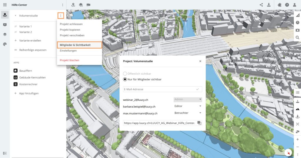Um die Mitglieder des Projektes zu verwalten, öffne das entsprechende Projekt und klicke auf den Button Mitglieder. Im geöffneten Pop-up kannst du nun weitere Mitglieder einladen oder die Sichtbarkeit des Projektes einstellen.