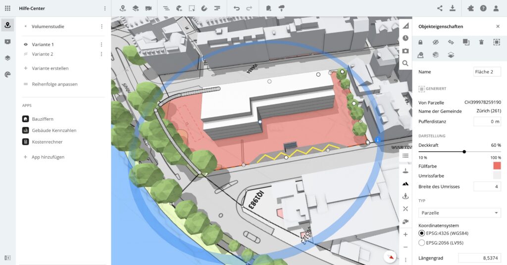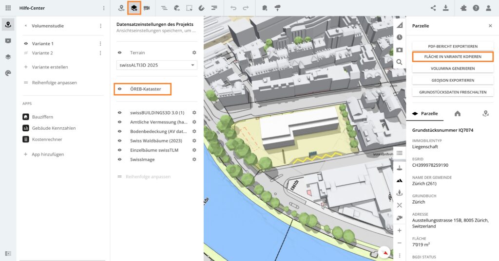 Kopiere beliebige Flächen (Parzellen, Strassen etc.) aus der Amtlichen Vermessung in deine Variante eines Projekts.