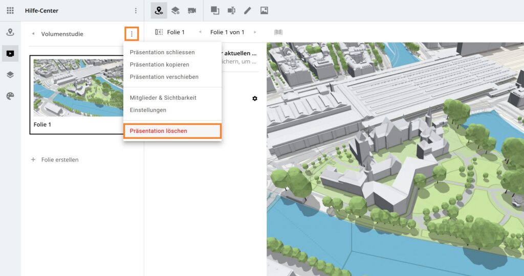 Um eine Präsentation zu löschen, gehe in die Arbeitsumgebung und klicke bei der Präsentation, welche gelöscht werden soll, auf das Kontextmenü. Klicke auf Präsentation löschen im Kontextmenü, danach muss das Löschen der Präsentation nochmals bestätigt werden. Klicke dazu auf den Button Löschen im geöffneten Pop-up.